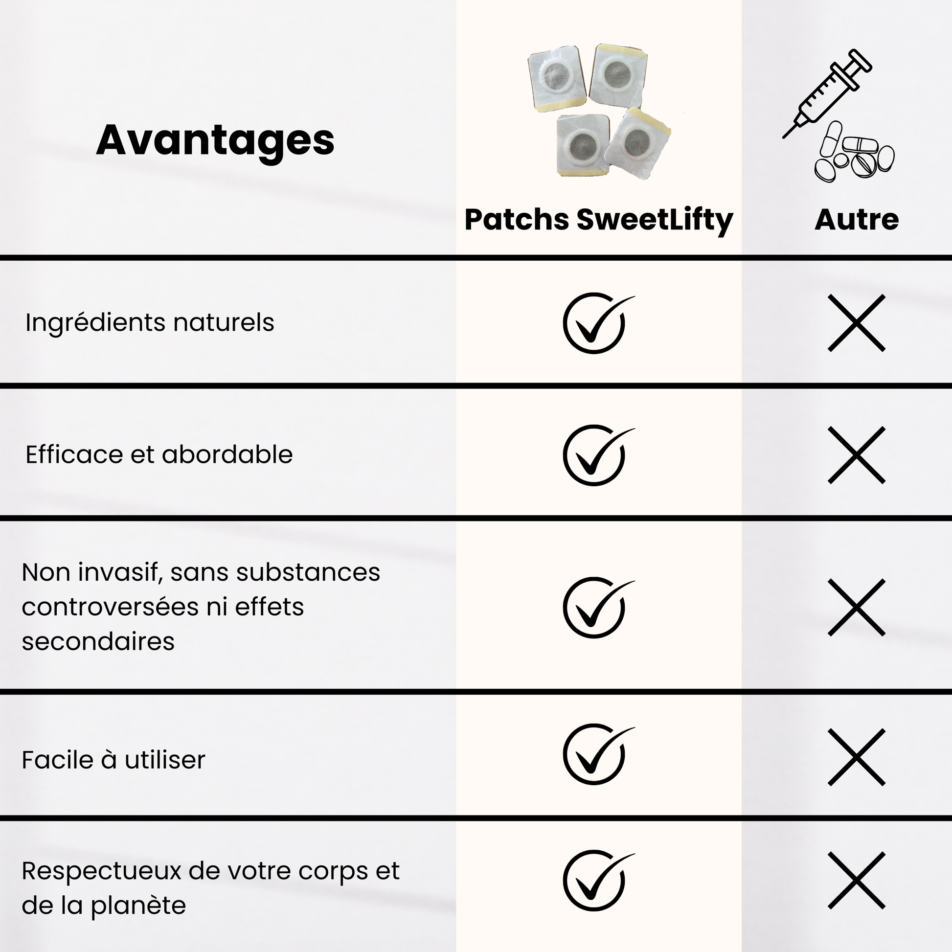 Fini la chirurgie, les régimes stricts, les pilules douteuses ou les méthodes invasives et coûteuses. Avec SweetPatch, affinez votre silhouette en douceur, sans douleur, sans aiguille et sans changer radicalement votre mode de vie. Des résultats visibles, en toute sécurité.